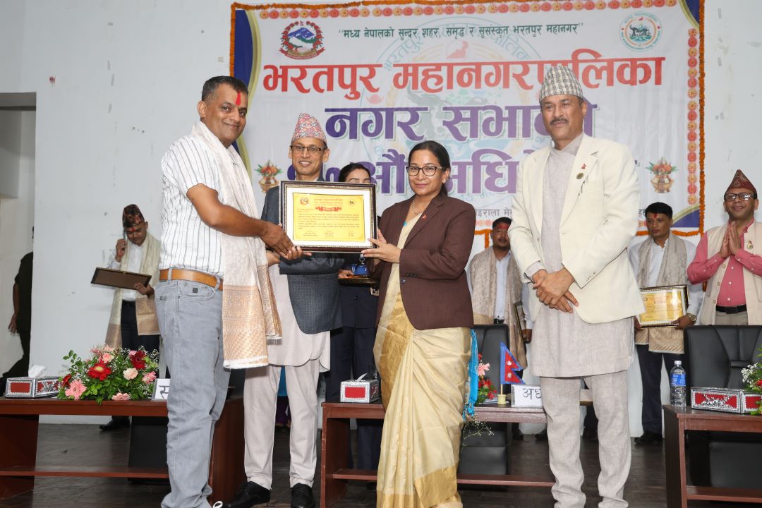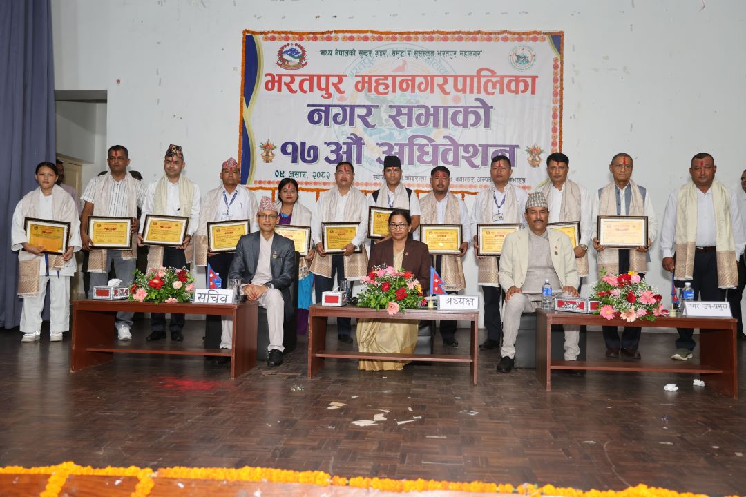 चितवन । भरतपुर महानगरपालिकाले १७ औँ नगर सभाको अवसरमा असल करदाता, निर्माण व्यवसायी, कर्मचारी तथा खेलाडीलाई पुरस्कृत तथा सम्मान गरिएको छ ।