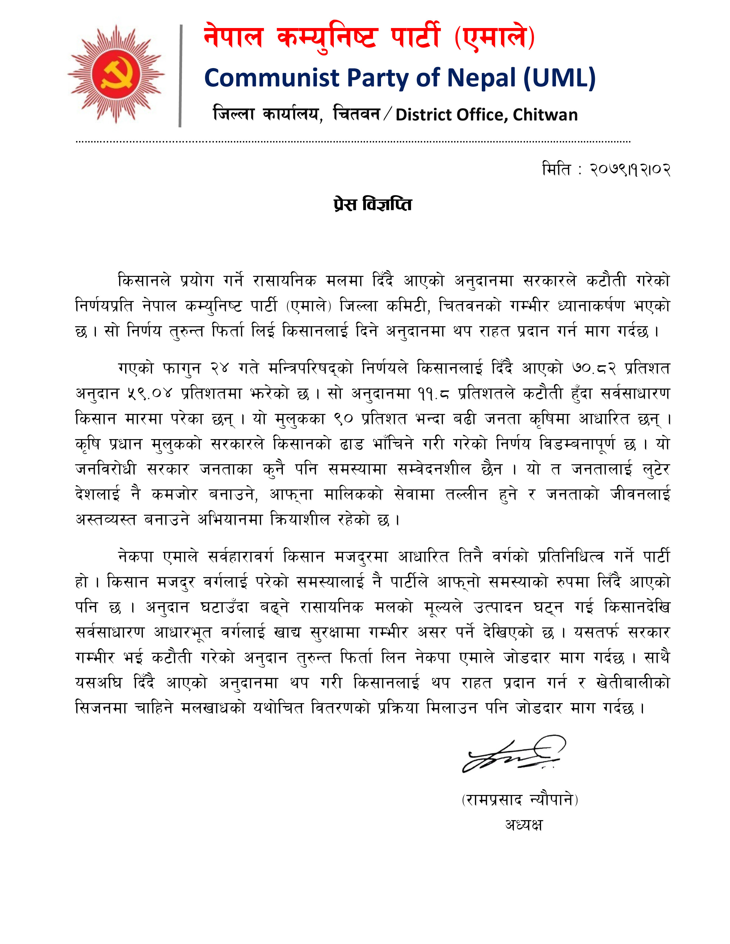 एमाले चितवनका अध्यक्ष रामप्रसाद न्यौपानले आज एक विज्ञप्ति प्रेषित गर्दै सरकारले गरेको निर्णय फिर्ता लिएर किसानलाई थप अनुदान दिन माग गरेको हो । विज्ञप्तिमा गत फागुन २४ गते मन्त्रिपरिषद्को निर्णयले किसानलाई दिँदै आएको ७०.८२ प्रतिशत अनुदान ५९.४ प्रतिशतमा झारेर ११.८ प्रतिशतले कटौती हुदा सर्वसाधारण किसान मारमा परेको जनाइएको छ । विज्ञप्तिमा भनिएको छ, ‘ यो मुलुकमा ९० प्रतिशत भन्दा बढी जनता कृषिमा आधारित छन् । कृषि प्रधान मुलुकको सरकारले किसानको ढाँड भाँचिने गरी गरेको निर्णय बिडम्बनापूर्ण छ । यो जनविरोधी सरकार जनताका कुनै पनि समस्यामा संवेदनशिल छैन । यो त जनतालाई लुटेर देशलाई नै कमजोर बनाउने, आफ्ना मालिकको सेवामा तल्लिन हुने र जनताको जीवनलाई अस्तव्यस्त बनाउने अभियानमा क्रियाशिल रहेको छ ।’ विज्ञप्तिमा एमाले सर्वहारा किसान वर्गको प्रतिनिधित्व गर्ने पार्टी भएकोले किसान मजदूर वर्गको समस्या पार्टीले आफ्नो समस्याको रुपमा लिँदै आएको उल्लेख गरिएको छ ।